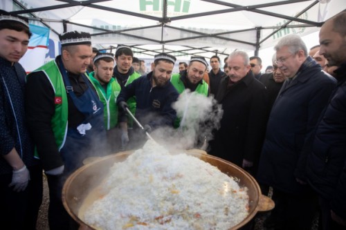 Председатель Великого национального собрания Турции Мустафа Шентоп посетил палатку прибывших из Узбекистана волонтеров, готовящих плов и другую горячую еду и раздающих ее пострадавшим от землетрясения.